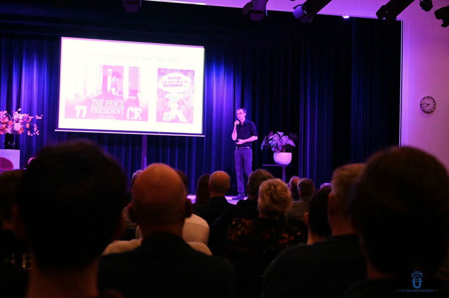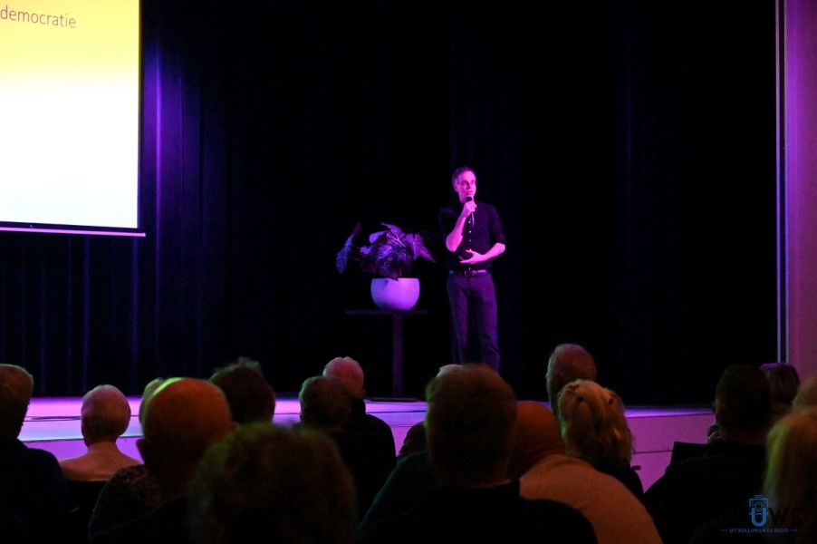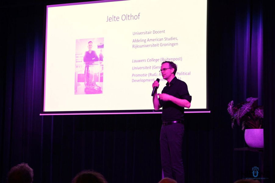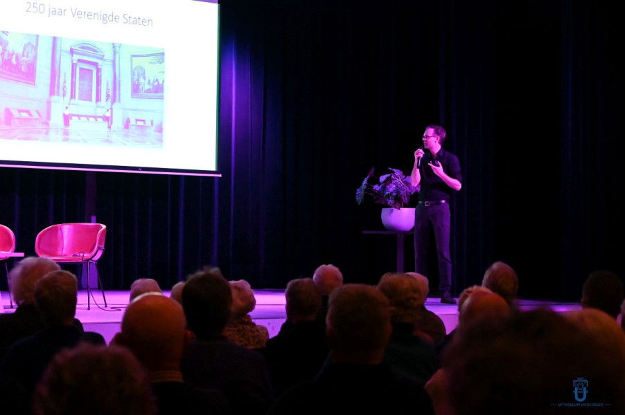 KOLLUM – In een uitverkocht Theater De Colle in Kollum gaf universitair docent Jelte Olthof woensdagavond een lezing over de ontwikkelingen in de Verenigde Staten onder Donald Trump. Aan de hand van een korte historische schets van de Amerikaanse democratie nam hij het publiek mee naar de huidige politieke situatie.
