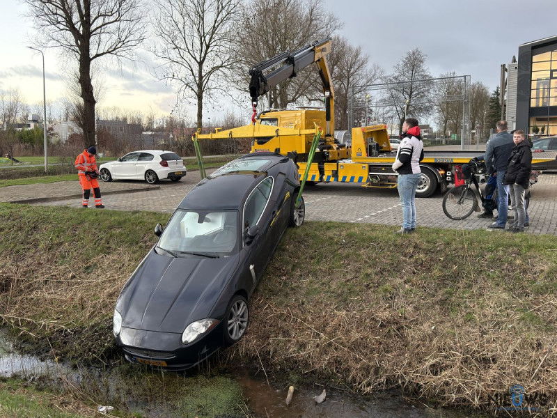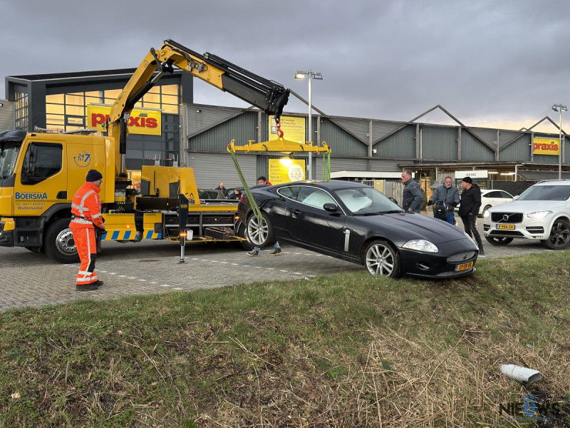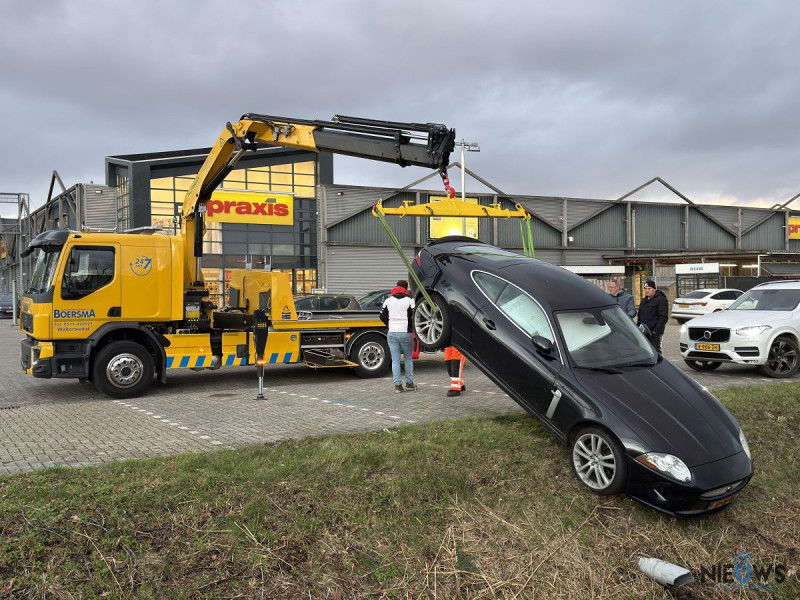 De bestuurder kon zelfstandig uit de auto komen en raakte niet gewond. Bergingsbedrijf Boersma heeft de auto weer op het parkeerterrein getakeld. De auto liep nagenoeg geen schade op.