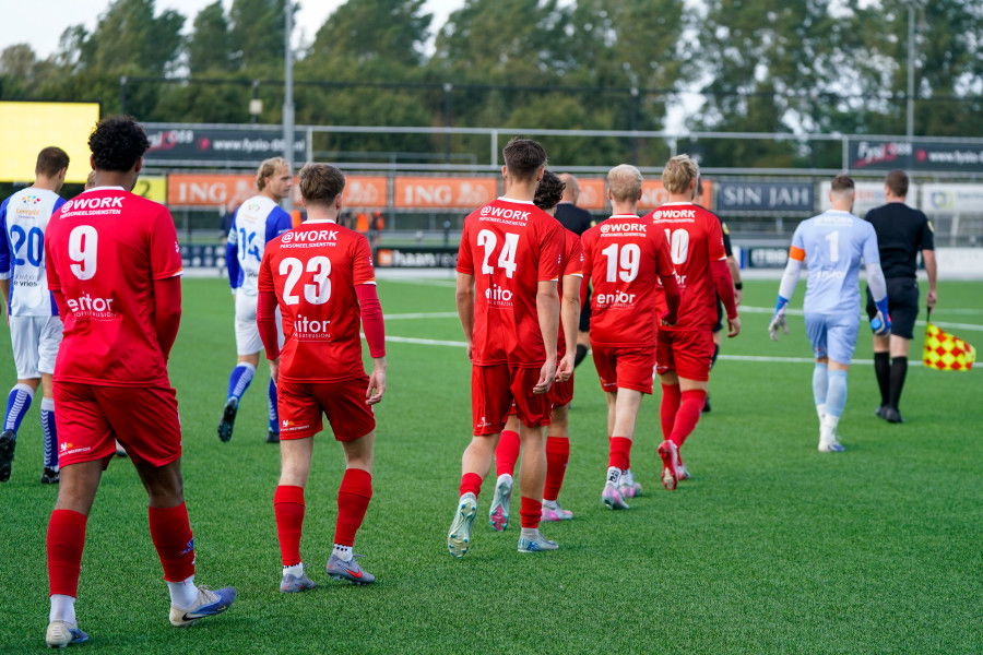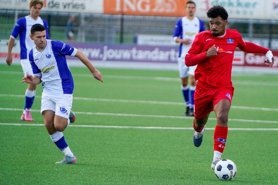 LEEUWARDEN – Spektakel, maar geen winnaar bij het duel tussen Blauw Wit’34 en VV Buitenpost: zaterdagmiddag werd het 1-1 in Leeuwarden. De Blauwkes, spelend in het rood, keken al snel tegen een achterstand aan na een doelpunt van Floris Boonstra. Credits voor de gelijkmaker kunnen met name naar Gerbrand Waaksma. Buitenpost speelde het laatste halfuur met tien man, omdat Jared Faleye – ongelukkig – twee gele kaarten pakte.