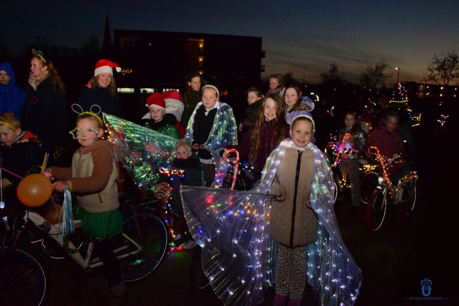 Leerlingen, ouders en teamleden trokken gezamenlijk door het dorp met hun mooiste lichtcreatie; verlichte fietsen, skelters, aanhangwagens met kerstbomen of stuntsteps. Alles kwam voorbij.