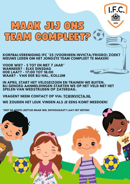 KOLLUM – KV IFC ’25 (voorheen Invicta/Frigro) gaat een nieuw korfbalteam opzetten! Sluit je aan bij het groepje kinderen dat al enthousiast is. Korfbal is geen heel bekende sport, maar wel superleuk! Het is een echte teamsport waarbij je samen plezier maakt, samen wint en verliest, en waar je ook sterk en behendig van wordt.