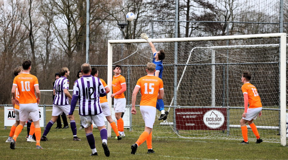 ADUARD – Vorige week werd al aangekondigd dat vv Kollum op 21 februari met de nodige personele perikelen zou moeten aantreden tegen Aduard 2000. Wel werd door trainer Jan Mulder en de inval assistent-trainer Arne Jan de Boer gekozen voor het vertrouwde spelconcept. In 20 minuten van de wedstrijd zag dat er ook goed uit. Aduard kon niet anders dan lange spelen richting spits en/of loeren op een countermogelijkheid. In de 10e minuut zag het publiek een mooie aanval van vv Kollum over de linkerkant via Finn Bosma en Benny de Vries. De bal werd klaargelegd voor Marten Postmus, maar zijn schot werd gekraakt.